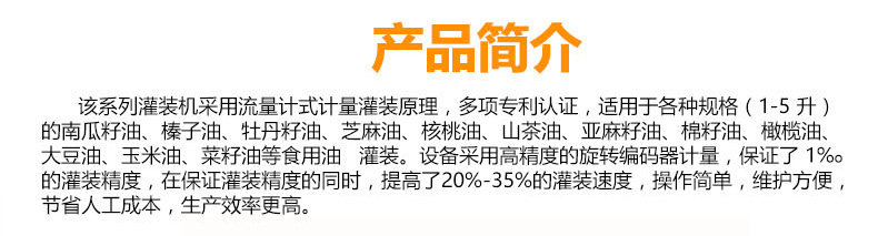 該系列灌裝機采用流量計式計量灌裝原理,多項認證,適用于各種規格(1-5升)的南瓜籽油、榛子油、牡丹籽油、芝麻油、核桃油、山茶油