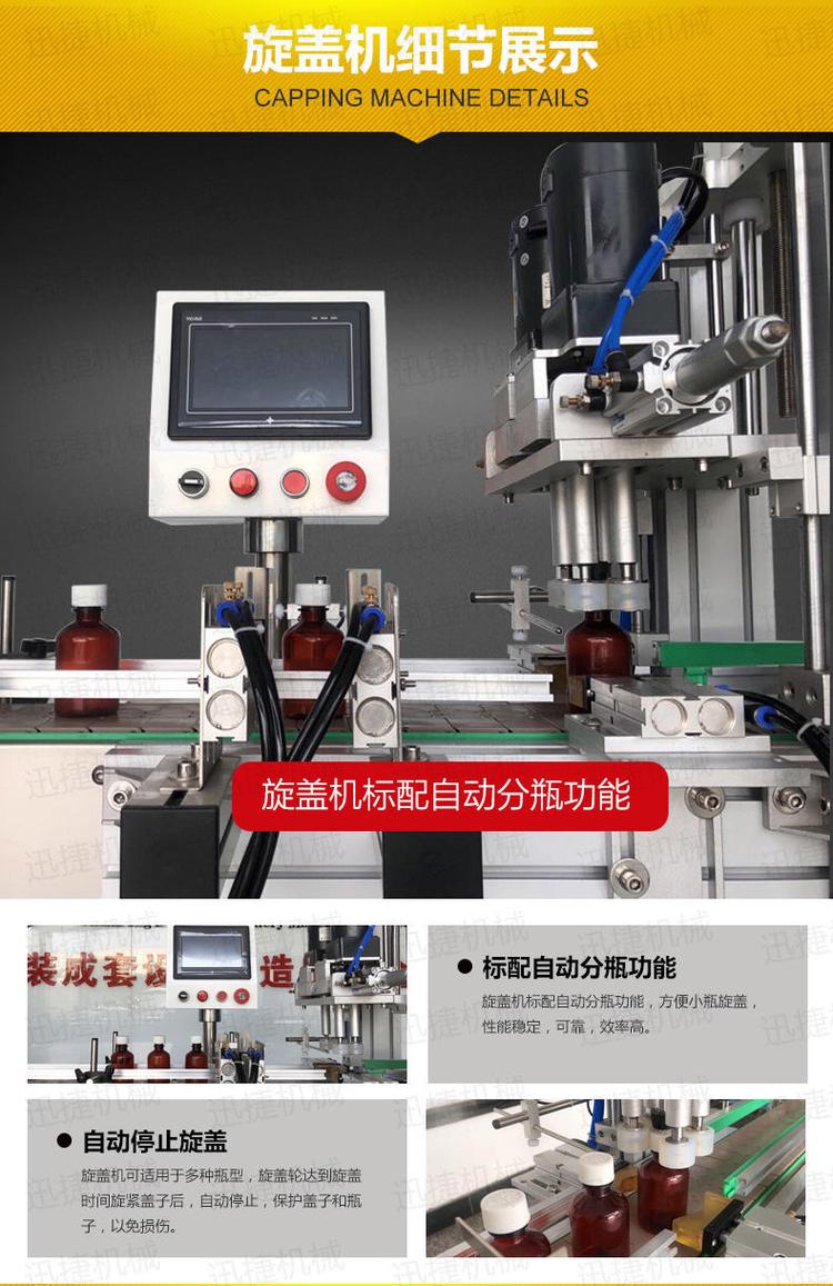 旋蓋優勢有:旋蓋機擁有做到自動分瓶功能,當瓶蓋旋緊時可自動停止旋蓋,保護了蓋子和瓶子免受損傷。塑料瓶消毒水灌裝機(小玻璃瓶溶液灌裝機)整機由304不銹鋼材質組成,灌裝效率和精度高,雙重保證您的物料的包裝效果。