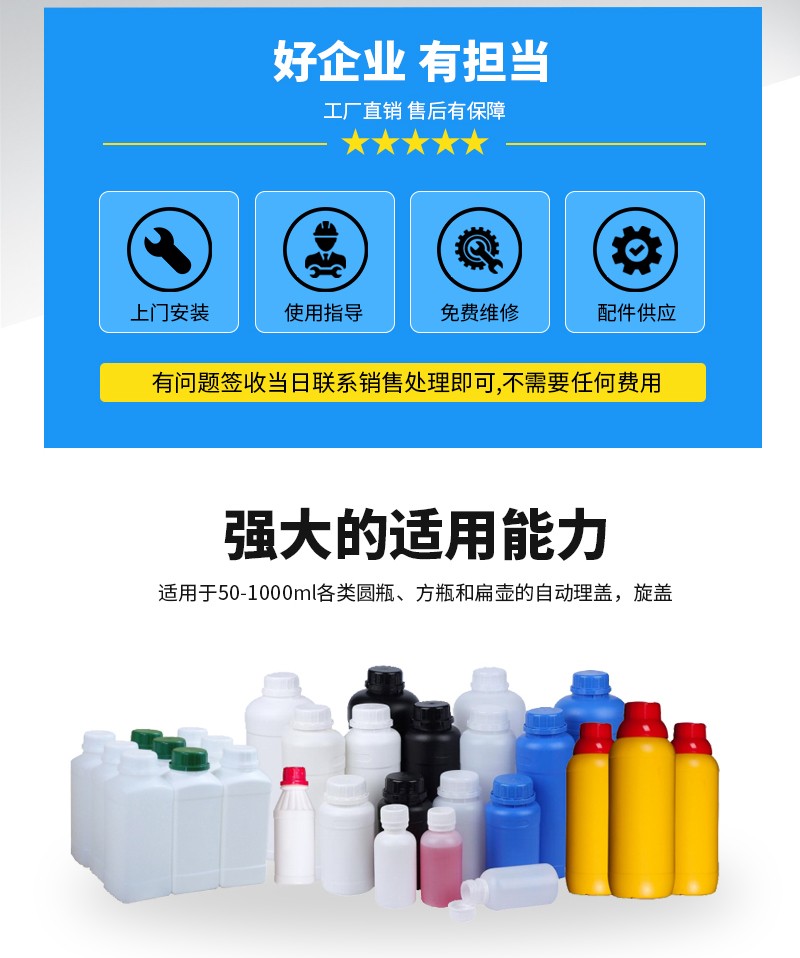 1、通用性強:適用于50-1000ml各類圓瓶、方瓶和扁壺的自動理蓋,旋蓋;