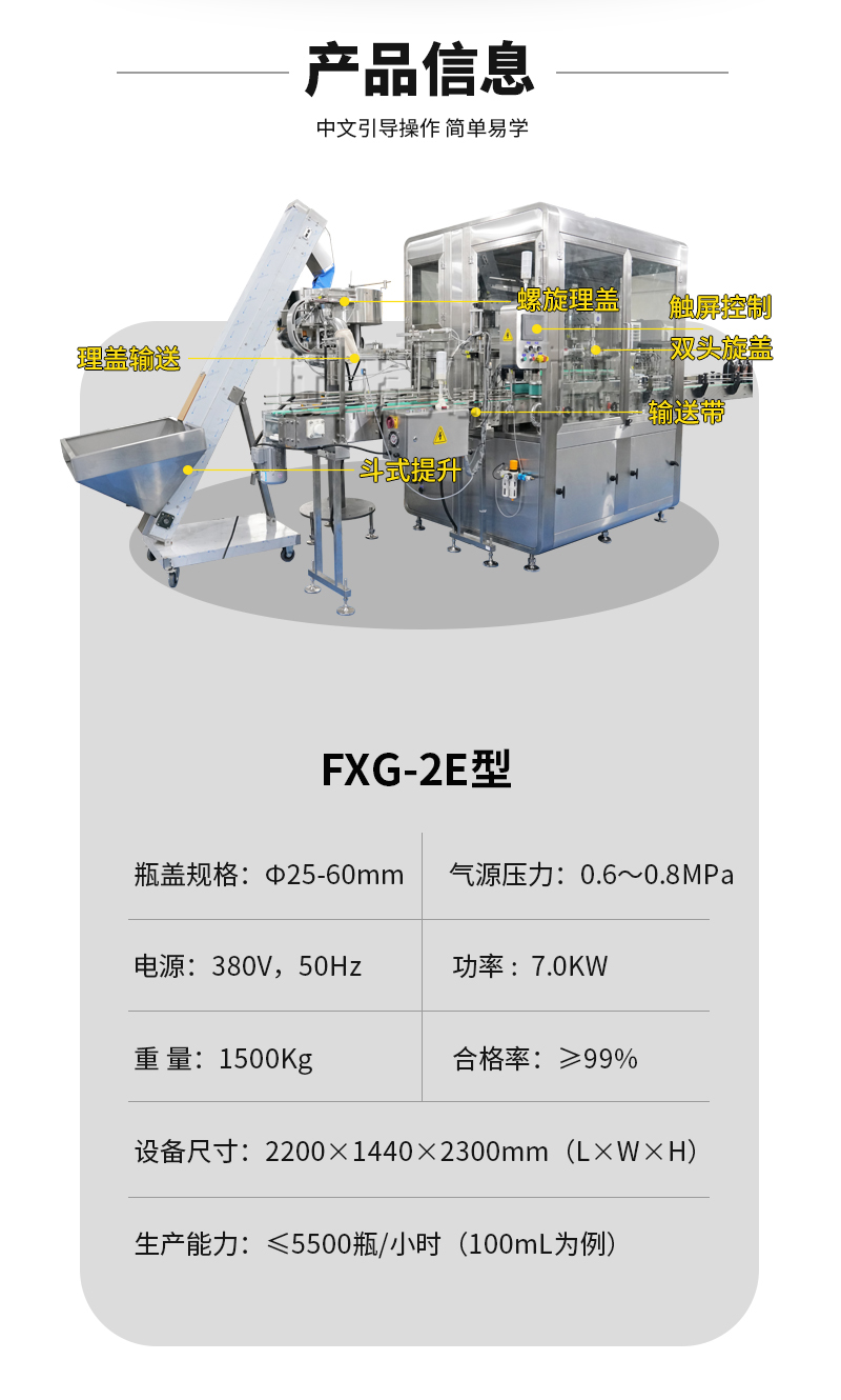 FXG-2E型全自動雙頭跟隨式旋蓋機由理蓋輸蓋機構、抓蓋旋蓋機構、運動模塊、輸送機構及控制系統組成。整機結構簡單、調整方便。該設備為我司新研制,產品在移動過程中,完成旋蓋動作。區別于常規旋蓋機,在旋蓋時需要停頓,會使物料晃出瓶口,污染瓶身。該機旋蓋不停頓,有效的避免了旋蓋停頓晃液,保持瓶身清潔。