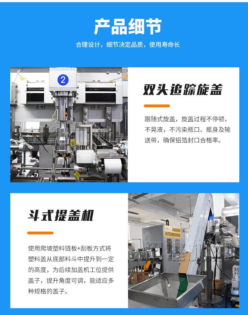 2、品質高:跟隨式旋蓋,旋蓋過程不停頓,不晃液,不污染瓶口、瓶身及輸送帶,確