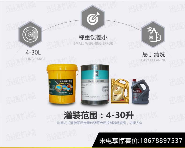 機油灌裝機適用于對4kg-25kg汽車用品類產品:潤滑油、防凍液、車用尿素等液體灌裝。自動完成計數進瓶、計重量灌裝、輸送出瓶等一系列操作。 特別適用于潤滑油、水劑、食用油的定量灌裝,是食品,醫藥,化妝品以及精細化工等行業的理想灌裝機。本機采用可編程控制器(PLC)、高速工控組態軟件進行實時監控的控制,使用調節方便。整機按GMP標準要求制作,各管路連接采用快裝方式,拆卸清洗方便,與物料接觸部位及外露部位均采用不銹鋼制造。整機安全、環保、安全、美觀、能適應各種不同環境工作。