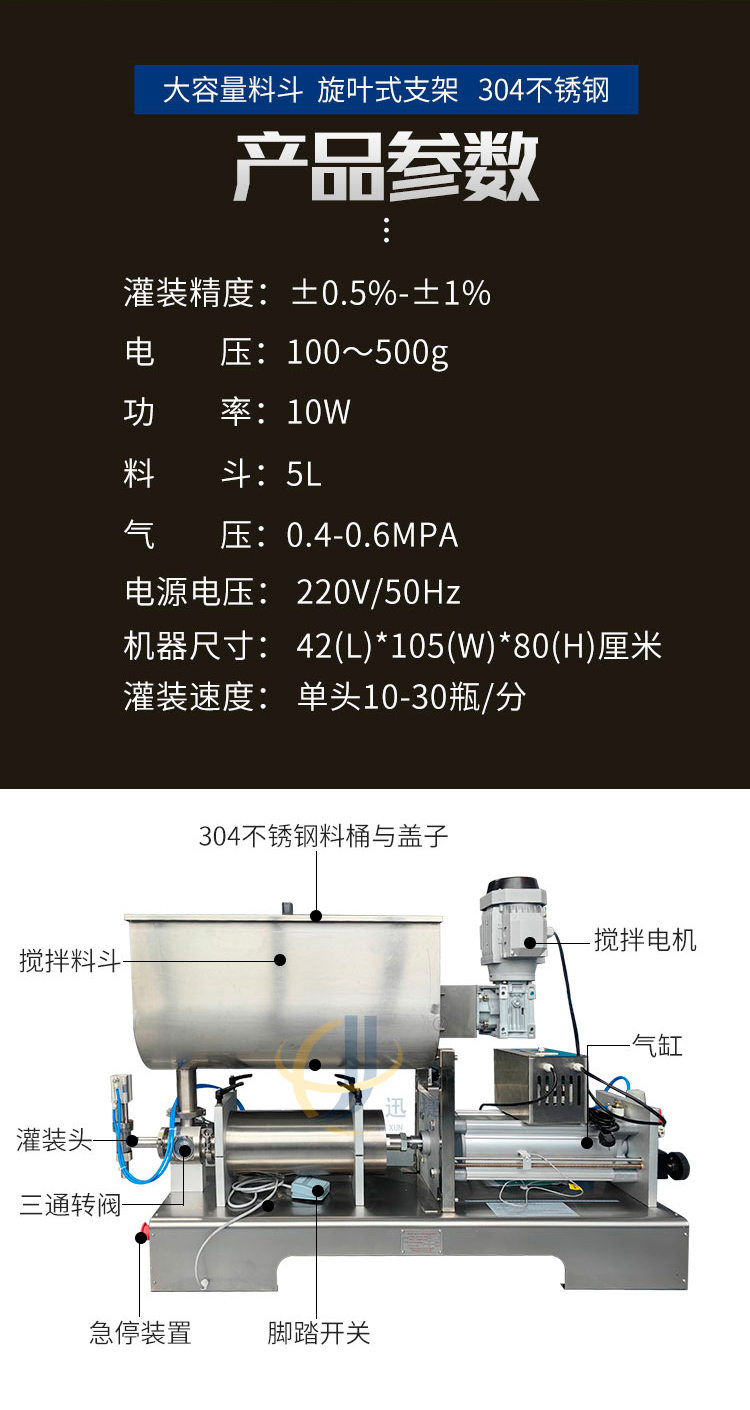本灌裝機采用臺灣正品亞德客氣缸,力度更大,效率更高!超大不銹鋼料斗,帶自動攪拌功能,保證灌裝產品,使產品灌裝更加均勻!灌裝嘴采用鋼精制成,精確灌裝不堵塞,防滴漏設計帶產品自提功能,灌裝更準確!