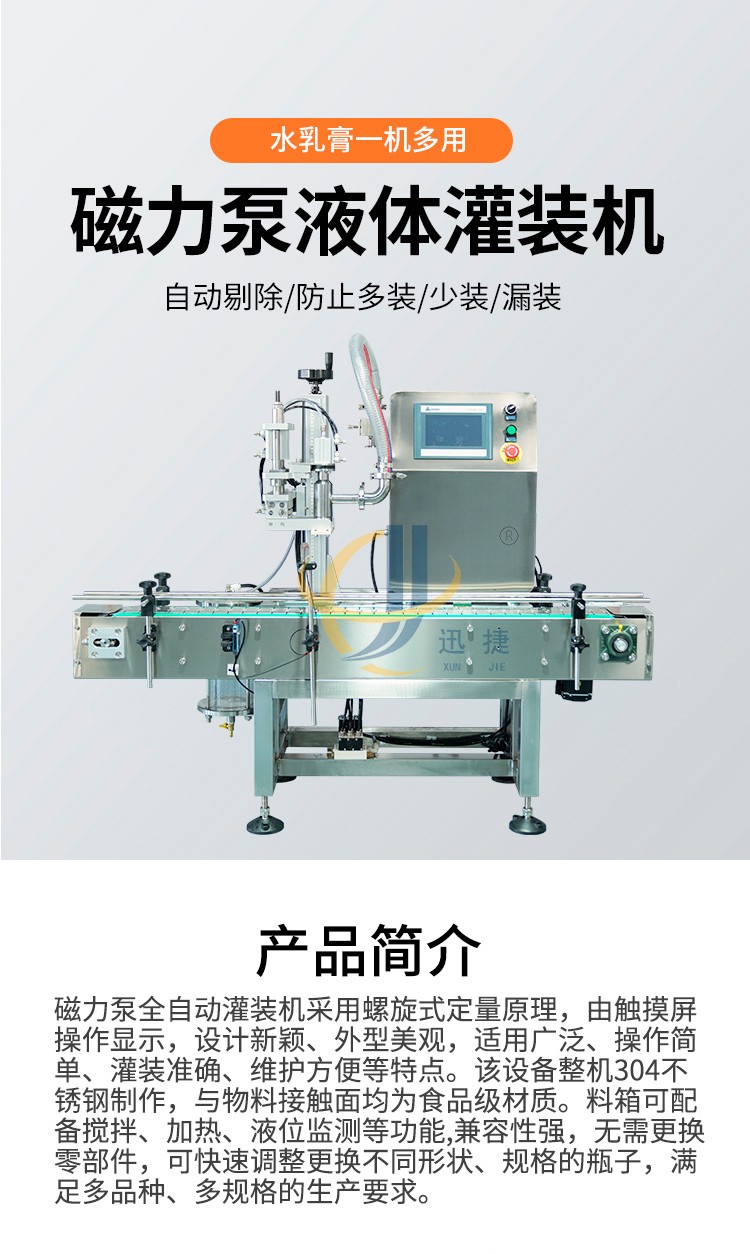 磁力泵全自動灌裝機采用螺旋式定量原理,由觸摸屏操作顯示,設計新穎、外型美觀,適用廣泛、操作簡